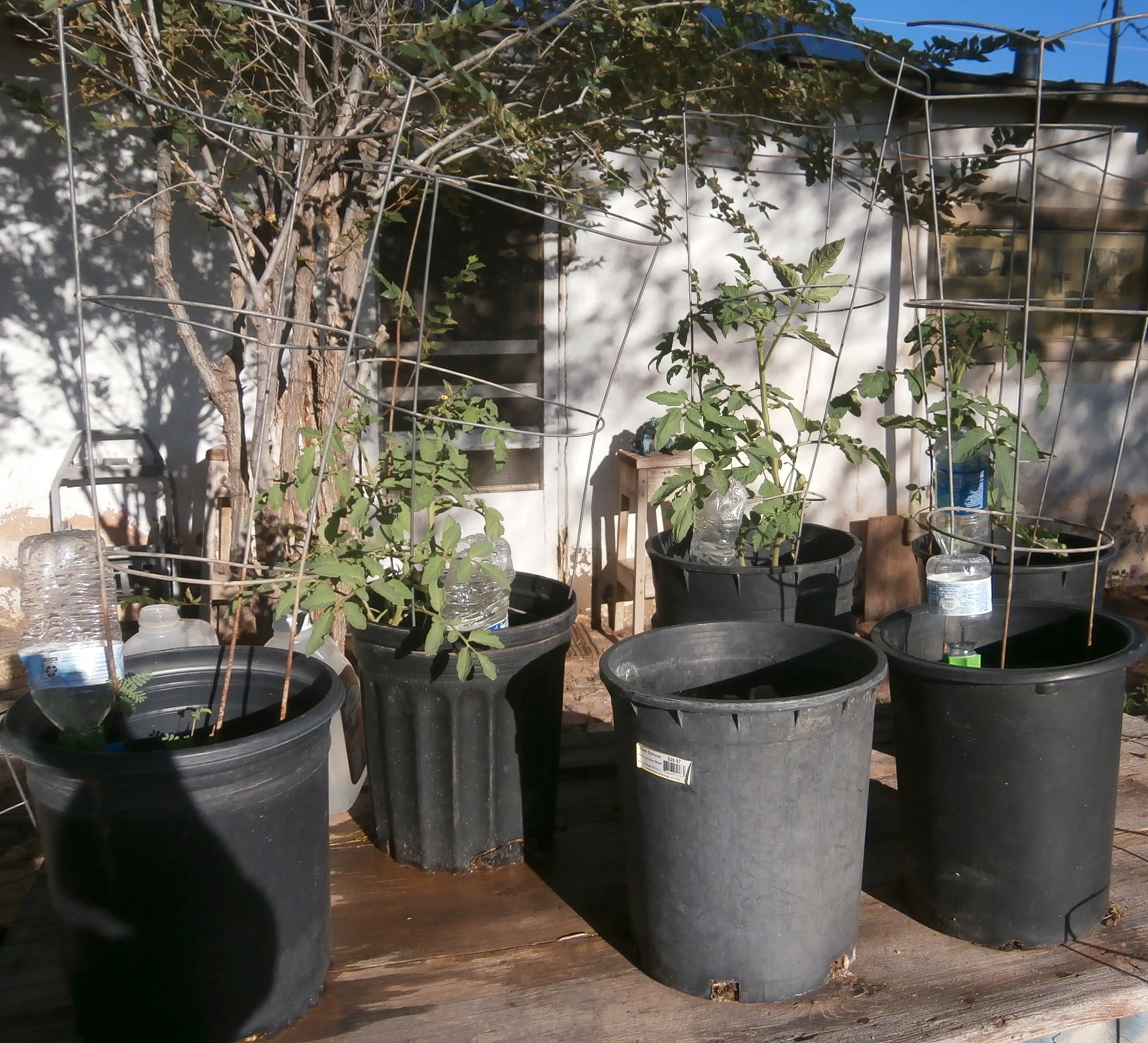 They are in pots, on top of a table that would be hard for the critters to reach, and the area around the table is booby-trapped! I was pleased and hopeful that I will now at least have some tomatoes. And — these are heirloom purple tomatoes, so I’m excited.