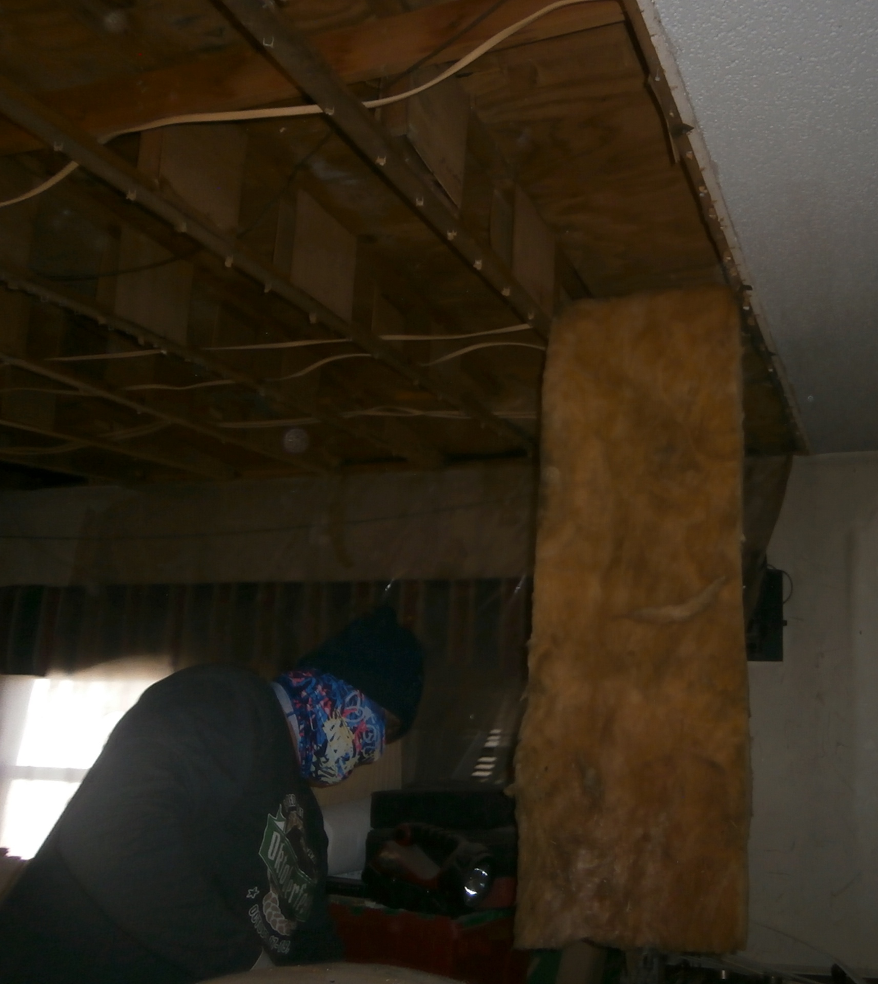 Due to roof leaks, we had to redo the ceiling in two rooms. First step, Jim went up and replaced most of the roof and the rest he patched. Fortunately, this was done before the weather turned arctic — it was chilly, but not insanely cold and windy yet.